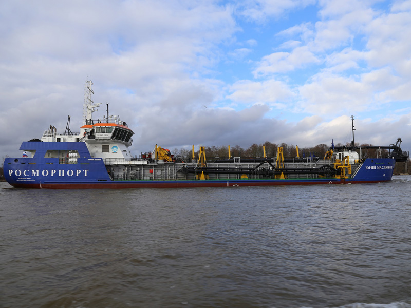 c) the Yuriy Maslyukov self-transporting bilge dredger with a hold capacity of 2,000 cubic meters, equipped with a suction dredger with a dragging soil receiver, a hydraulic washout system and mechanical rippers,