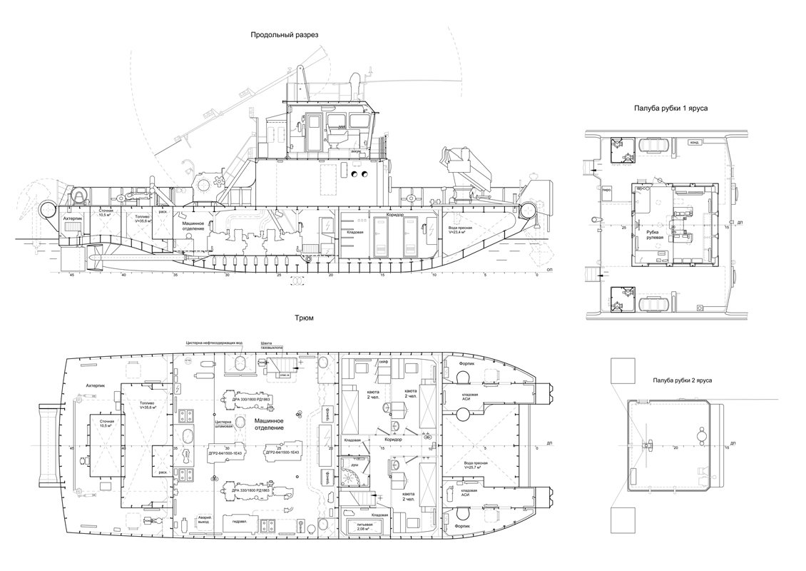 The ship is designed to collect oil-containing water from vessels, settle it, separate it with pumping oil products into an oil residue tank and deliver the oil residue ashore to the storage, separated clean water - ashore or overboard in permitted areas.