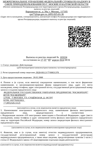 Licence of the FSUE "Rosmorport" Azov Basin Branch for the use of subsurface resources at the Yuzhnotaganrogskiy 3 Area for extracting technical underwaters to provide for the industrial object