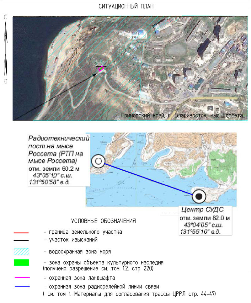 - project for the construction of a radio technical post at Cape Rosset. As part of the project, it is planned to build a distribution station at Cape Rosset, in connection with the dismantling of the existing Elena VTS site, located on the island of Elena, on top of Mount Larionov (Vladivostok City District), in connection with the decision of the Administration of the city of Vladivostok dated 18.05.2015 No. 28/6-2959 on the need to vacate the occupied land plot of the Vladivostok urban district. The project documentation, developed by a specialized organization, received a negative opinion from the FAI "Glavgosexpertiza of Russia" due to the location of the projected object within the boundaries of the buffer zone of the landscape of monuments of the historical center of Vladivostok. In order to eliminate this remark, work was carried out to develop the documentation “Project for the protection zone of the cultural heritage site “Shkotovsky range of lighthouses (lighthouse, two leading signs)”. Based on the results of the work done, the Decree of the Government of Primorsky Territory dated 26.01.2022 No. 32-pp “On the establishment of zones for the protection of a cultural heritage object (monument of history and culture) of the peoples of the Russian Federation of regional significance “Shkotovsky range of lighthouses (lighthouse, two leading signs)” established the possibility of building an object in the cultural heritage zone. Currently, due to the termination of the contract with the previous design organization, a competitive selection of a specialized design organization is being carried out to carry out work on the new design.