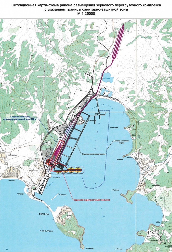 - project for the construction of a grain terminalПлан строительства зернового терминала в морском порту Зарубино in the seaport of Zarubino. Within the framework of this investment project implementation, in terms of obligations of FSUE “Rosmorport”, it is planned to construct port water area (operational water area, maneuvering water area, anchorages, marine approach roads) with the area of 32 hectares with depths up to -19 m, build a vessel traffic control system, install navigation equipment, construct administrative and domestic buildings (premises) for port services. Implementation of the project in terms of the enterprise's obligations will make it possible to ensure the approach and berthing of the vessels of “Post-Panamax” and “Handysize” types to berths No. 1 and No. 2 in the seaport of Zarubino. The design is currently on hold due to the need to clarify the boundaries of the shoreline in Trinity Bay.