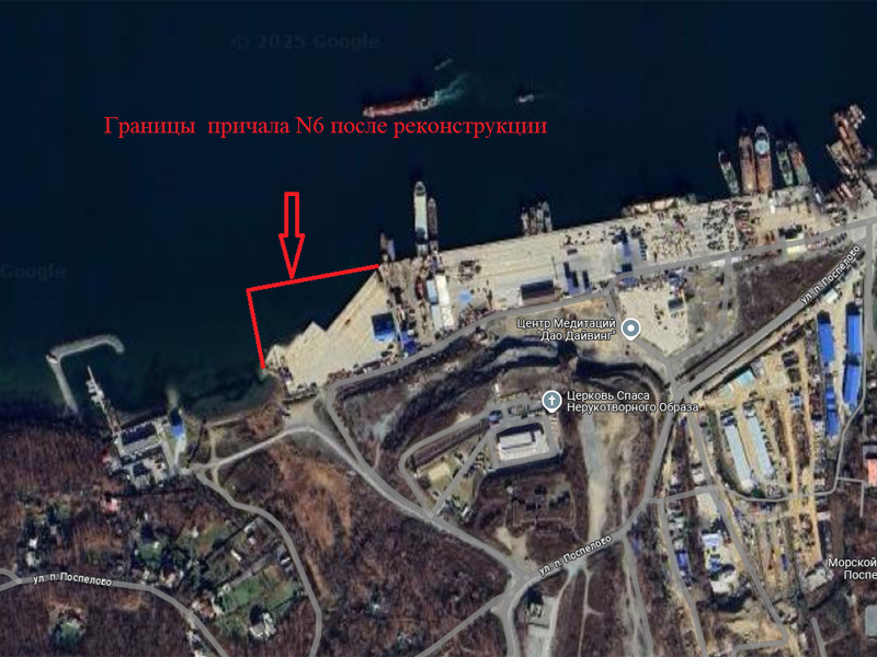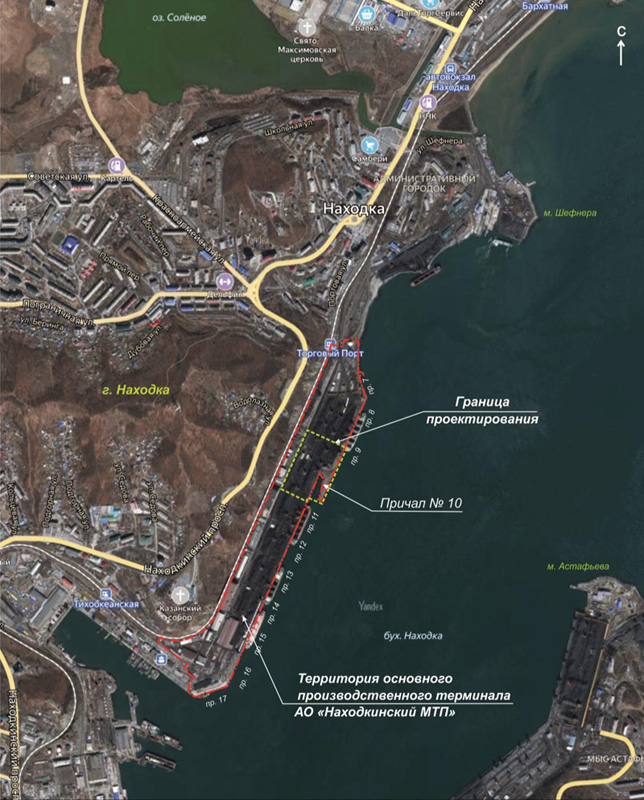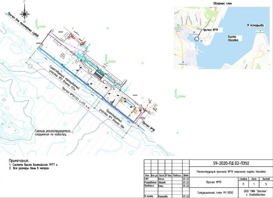 - project for the reconstruction of berth No. 19Ситуационный план причала № 19 of the Nakhodka seaport. As part of the implementation of the infrastructure project, it is planned to bring the cordon and the berth area to the required level, to install a vertical sheet pile wall in the form of an anchored revetment on a 58 m section, to lay engineering networks, lengthen the existing storm sewer outlet, to cover the berth area and install a rain sewer system with local rainwater treatment facilities to clean surface water. (rain, thawed and irrigation) waters from the berth, as well as dredging on an area of 0.78 hectares to the design marks of -9.35 m. The project implementation will make it possible to bring the condition of a separate part of berth No. 19 at the length of 58 m into compliance with technical requirements, as well as to create safe conditions for the dredging fleet of the branch and the possibility to receive local passenger vessels of 10 thousand tons displacement, up to a length of 140 m, a width of 19.2 m and a cargo draft of 6.8 m.