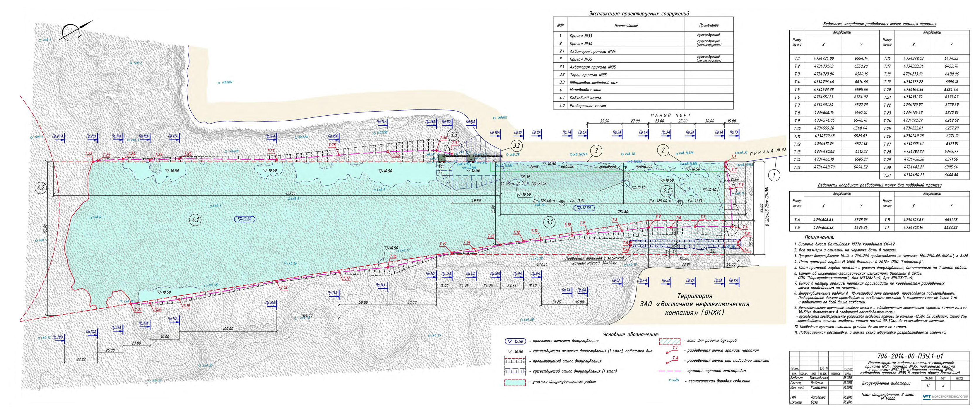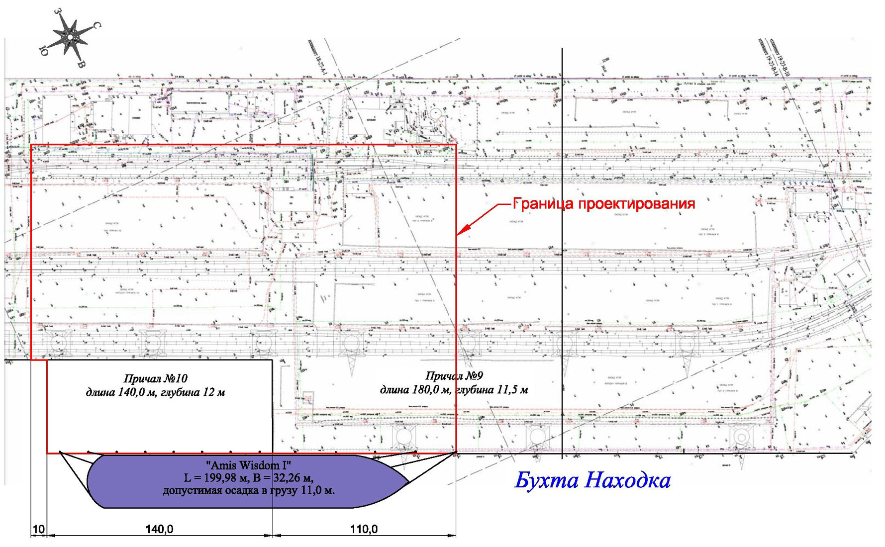 - operational water areas of berth No. 1 with a total area of 9.6 hectares and berth No. 2 with a total area of 10.8 hectares, with a bottom elevation of -17.8 m, designed for maneuvering and mooring vessels 266 m long, 40.5 m wide, and with a loaded draft of 15.4 m;