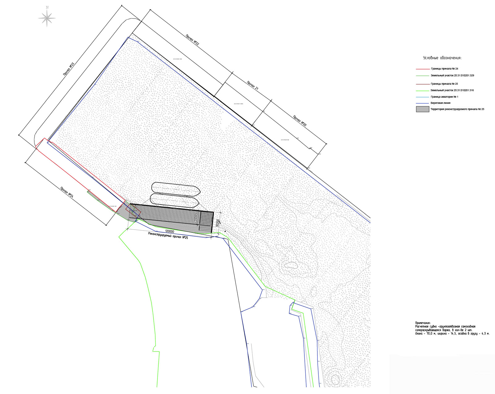 - project for the reconstruction of berth No. 25Layout plan of berth No. 25 of the seaport of Nakhodka. The project envisages replacing the 19.5 m long pile berth with a bulwark berth of at least 120 m long. With this, it will be possible to use the berth for placing dredging vessels of the FSUE “Rosmorport” Far Eastern Basin Branch up to 70 m long, up to 14.5 m wide and with a loaded draft of 4.3 m.
