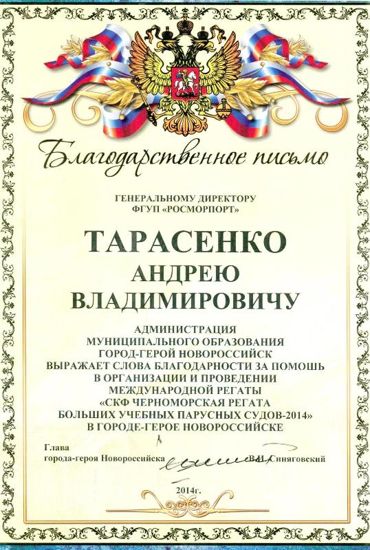 In the end of the meeting Sergey Shishkaryov, Chairman of the Presidium presented a letter of gratitude to Andrey Tarasenko for help to arrange and hold the international regatta SCF Blask Sea Tall Ships Regatta – 2014 in the hero-town of Novorossiysk.