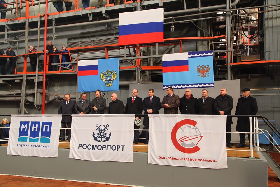 Deputy Minister of Transport of Russia Victor Olerskyi, General Director of FSUE “Rosmorport” Andrey Tarasenko, General Director of JSC “Krasnoe Sormovo Plant” Nikolay Zharkov, General Director of MNP Group Dmitry Hritin,  Head of Nizhny Novgorod city Oleg Sorokin and Acting Minister of Industry and Innovation of the Nizhny Novgorod Region Igor Sazonov took part in the keel laying ceremony.