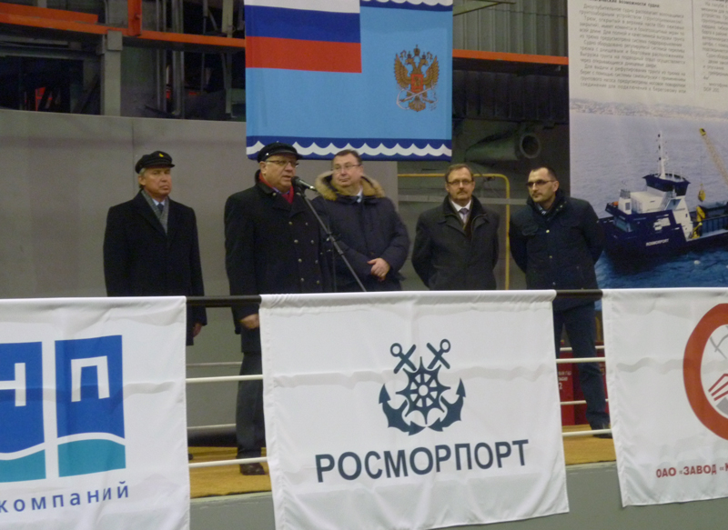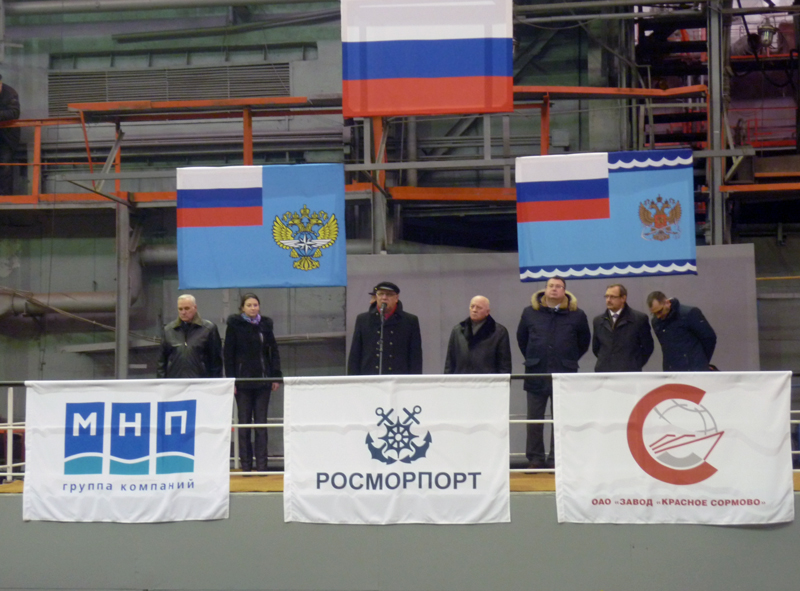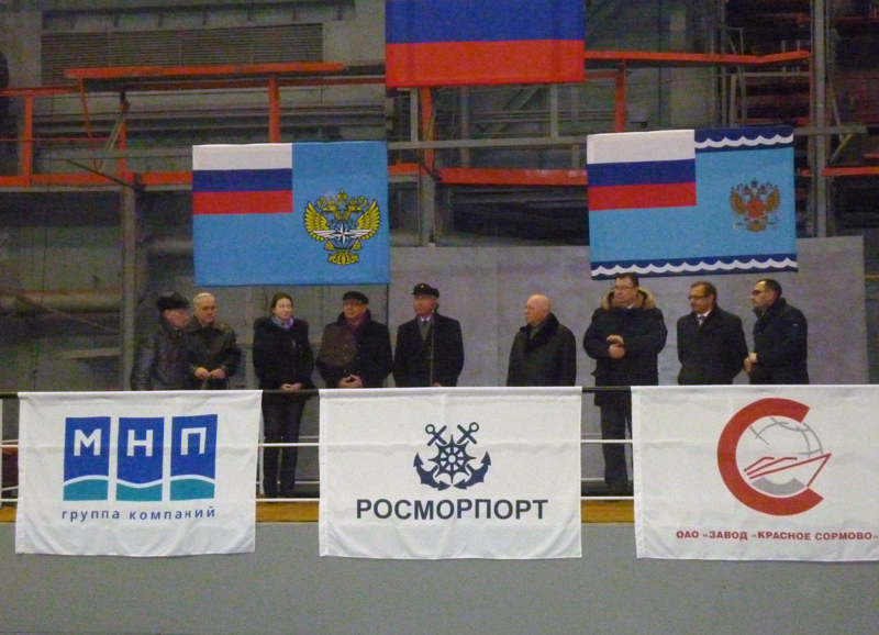 Representatives of FSUE “Rosmorport” including Deputy General Director for Fleet of FSUE “Rosmorport” Sergey Kurov and Head of Fleet Development and Construction Department of FSUE “Rosmorport” Vladimir Shtrambrand, and also General Director of JSC “Krasnoe Sormovo Plant” Nikolay Zharkov and Executive Director of MNP Group Vadim Malov took part in the keel laying ceremony.