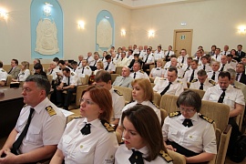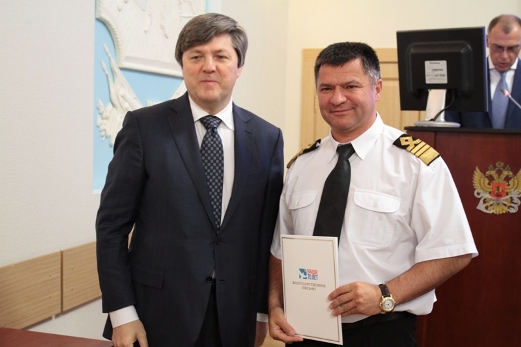 Viktor Olersky congratulated the audience on approaching professional holiday and expressed gratitude for transport support provided for the events dedicated to the Victory in the Great Patriotic War of 1941 – 1945 and handed letters of thanks from Mintrans of Russia to employees of Rosmorrechflot subordinate enterprises.