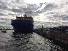 Vladivostok is an icebreaker of a new generation with unlimited navigation area and highly automated equipment. It can go through ice with width of up to 1.5 m. It is propelled by two full-revolving rudders.