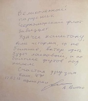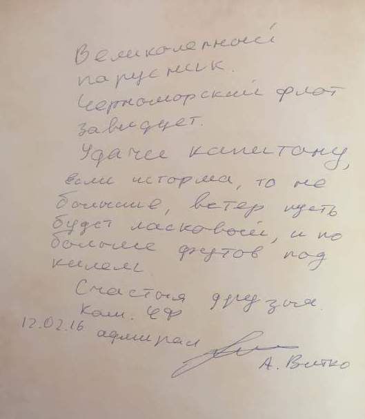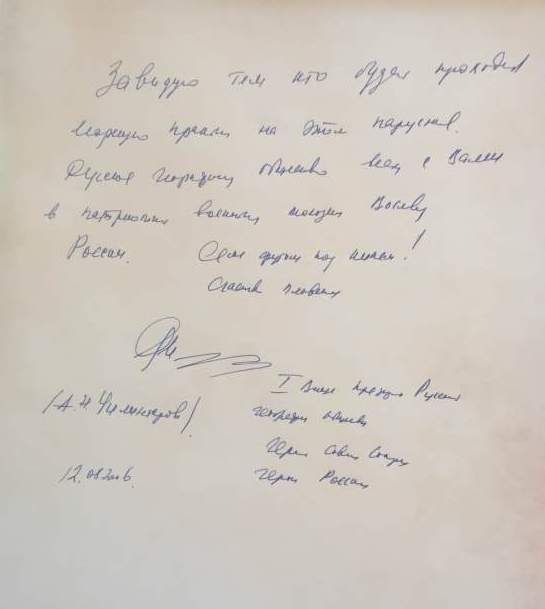 In the book of honorable guests there were made notes by the Commander of the Black Sea Fleet Aleksandr Vitko and the First Vice-President of the Russian Geographic Society Artur Chilingarov.