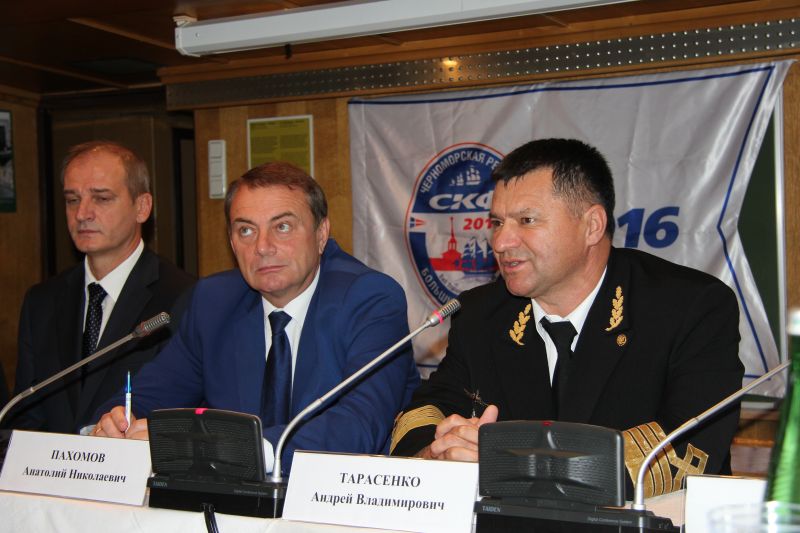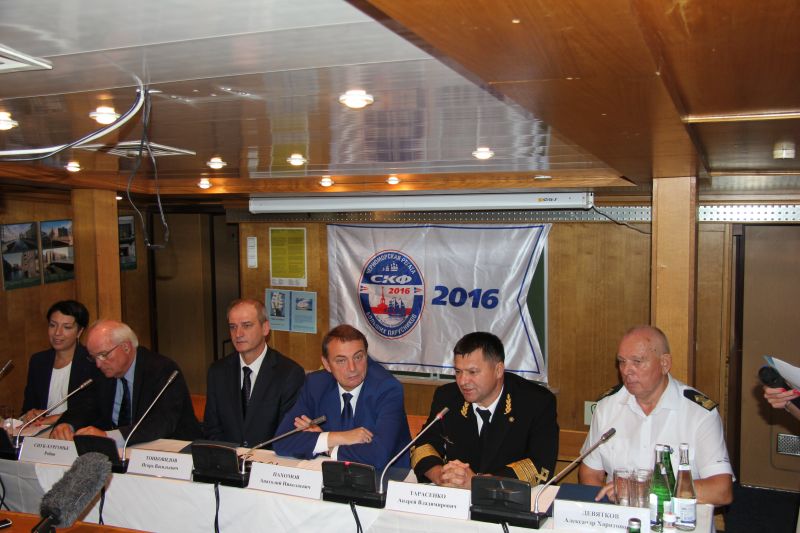 After the opening ceremony a press-conference was held on board of Mir sailing ship owned by FSUE “Rosmorport”. The conference was attended by Anatoliy Pakhomov, Robin Snouck Hurgronje, Igor Tonkovidov and also the FSUE “Rosmorport” General Director Andrey Tarasenko, and the FSBI “Black Sea Seaports Administration” Navigation Safety Department Head Aleksandr Devyatkov.