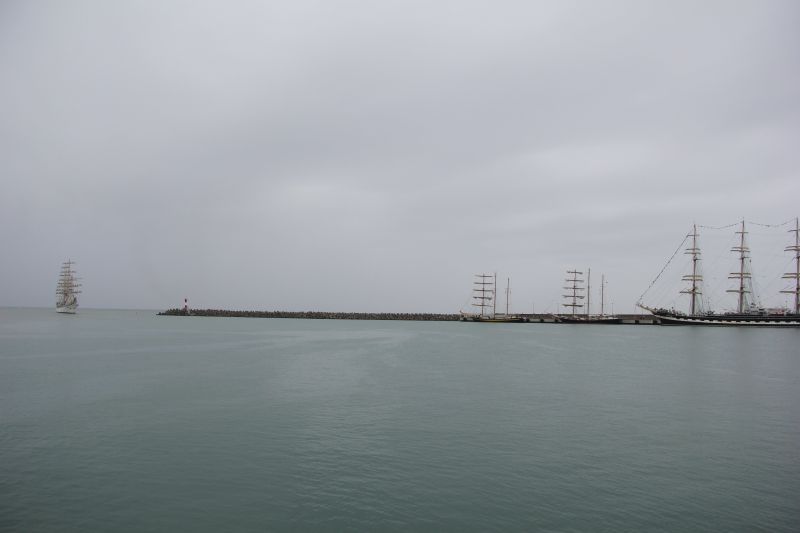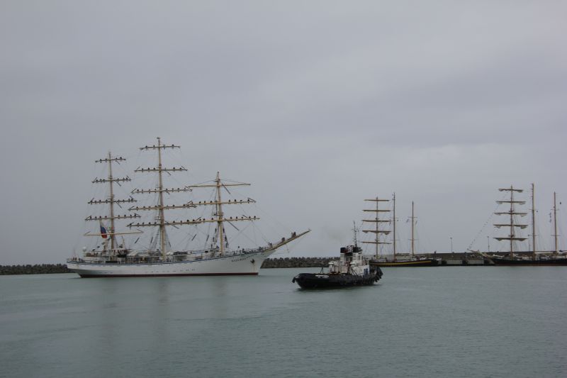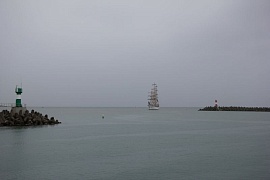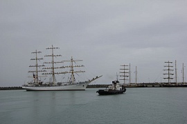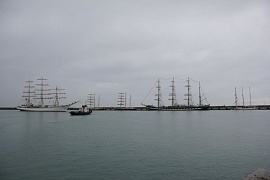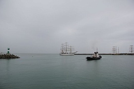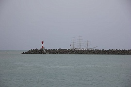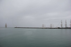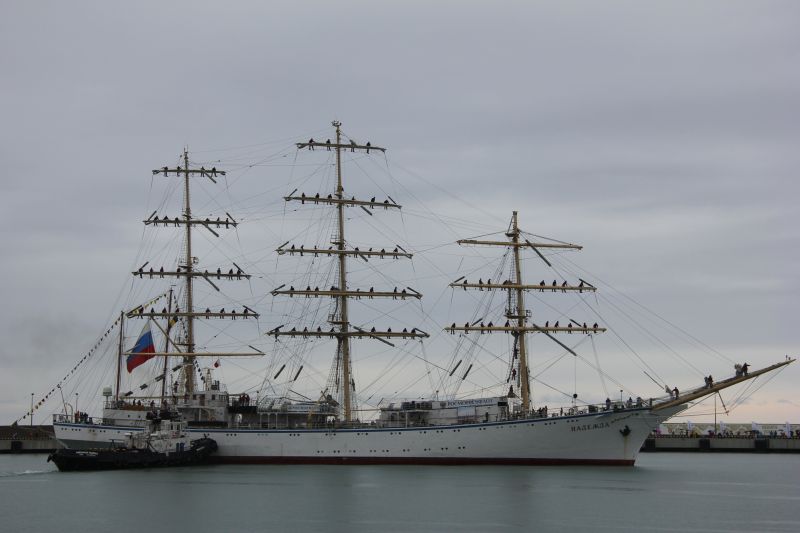 On September 22, 2016 after midday Nadezhda sailing ship moored in the Kruiznaya Harbor of the seaport of Sochi. The vessel entered the seaport and not changing its traditions the sailing ship cadets greeted audience with ceremonial forming-up aloft, once again having demonstrated professionalism and skills of the team. When entering the seaport water area ceremonial music was heard from Nadezhda board. The other vessels participating in the regatta greeted the sailing ship with ship's whistles. The city residents also warmly welcomed the vessel, inspite of pouring rain they came to the seaport to take part in the Black Sea Tall Ships 2016 events.