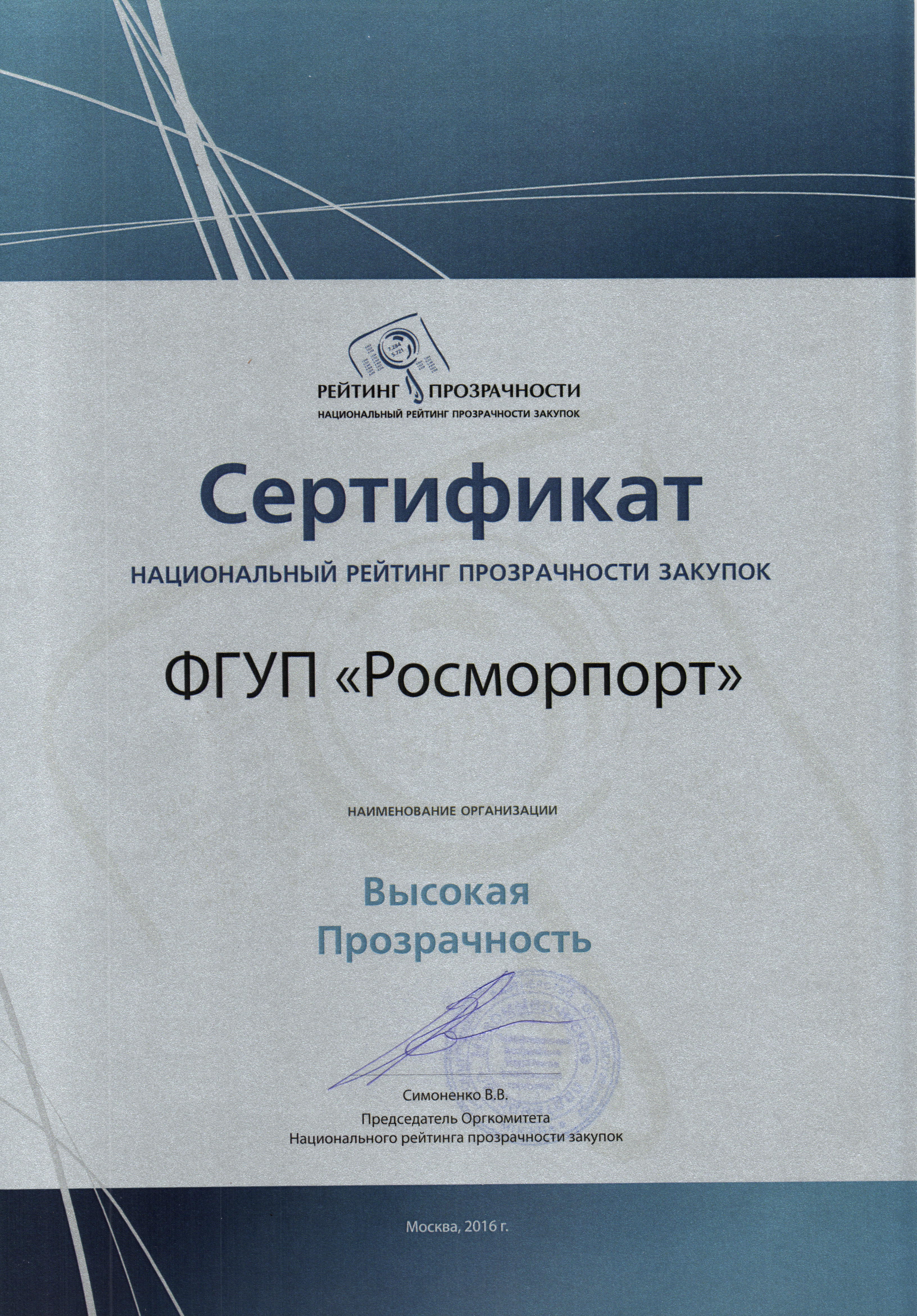 FSUE “Rosmorport” is included in the list of organizations carrying out procurements in accordance with the requirement of the Federal Law No. 223-FZ dated 18.07.2011, which have the level of “high transparency” of procurement activities. The summing up of the “National Rating of Procurement Transparency” results was held on December 2016.