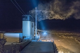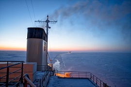 On January 19, in accordance with the plan of the pilotage on the East to the ice tip and exit of vessels on clean water icebreakers Admiral Makarov and Kapitan Dranitsyn performed reconnaissance of ice conditions in the vicinity of Shelagskiy Cape. In this section the passage northwards to the area of slighter ice is blocked.