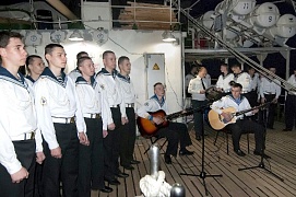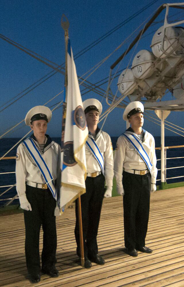 On May 9 the celebrations marking Victory Day in the Great Patriotic War took place aboard the ship. During the solemn ceremony, the state colors of the Russian Federation were hoisted. Captain Sergei Vorobyov congratulated the ship's crew and cadets with the Victory Day. In the evening cadets organized gala concert.