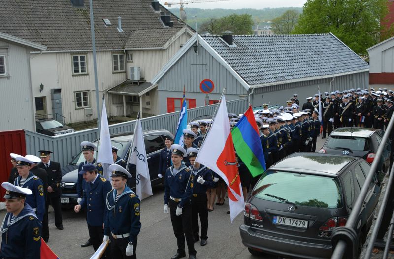 Cadets, undergoing navigational training practice on the sailing ship, participated in the citywide celebratory parade. The captain and the crew of the ship paid homage to deceased sailors and laid wreaths to the Piramida monument devoted to the dead in World War II.