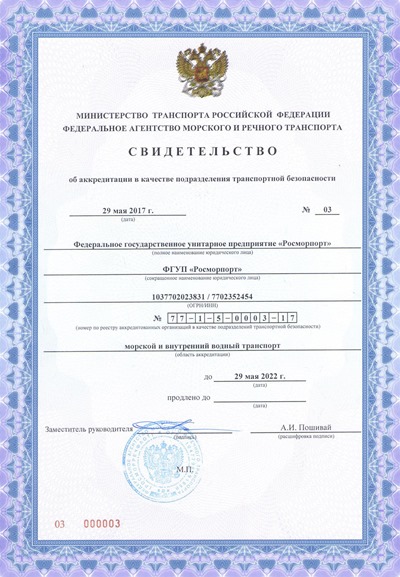 Following the results of considering the enterprise's statement according to the established procedure the Rosmorrechflot issued Certificate No 03 of May 29, 2017 to accredit FSUE “Rosmorport” as a transportation security unit.