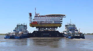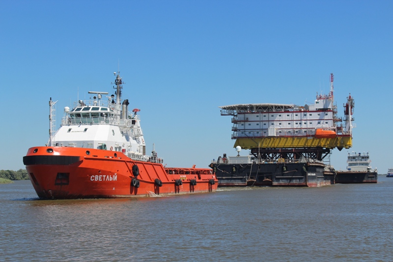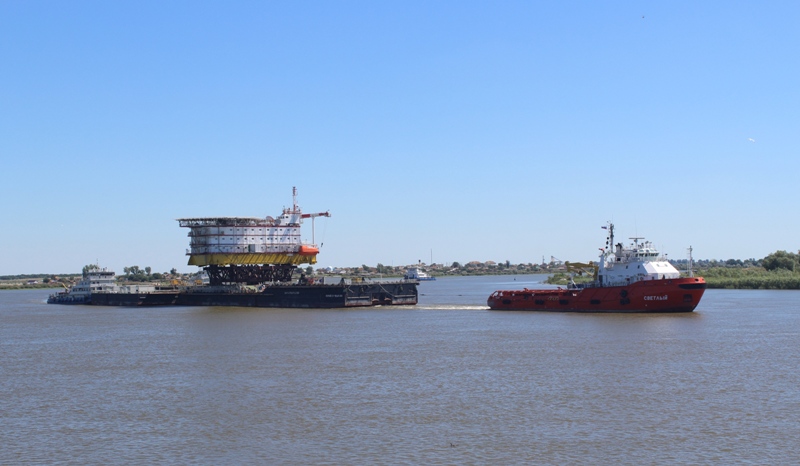 On June, 27 2017, the move of tug and tow caravan from the Seaport of Astrakhan towards the V. Filanovsky Field began. Five auxiliary vessels and a complex of the topside floating residential module platform (FRM-2), which is placed on the transport and installation barge "Yurii Kuvykin", will cover a distance of about 230 km. Most of the route will pass through the Volgo-Caspian Marine Shipping Canal.