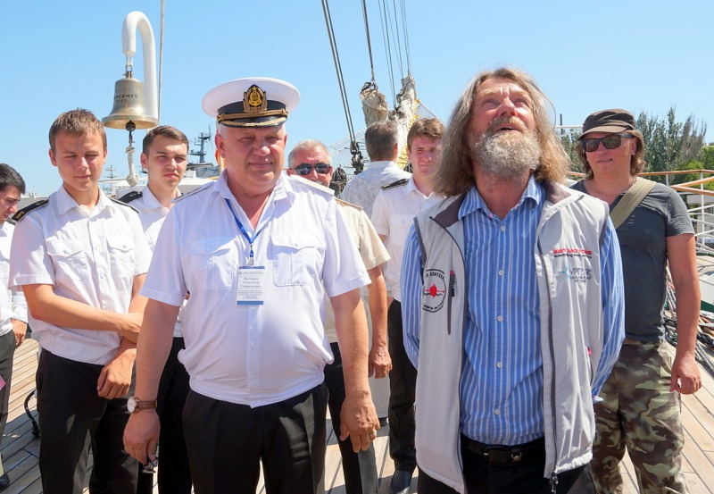 A commemorative meeting of travelers Fedor Konyukhov and Leonid Kruglov with the crew and cadets was held aboard the Khersones sailing ship on June 26, 2017. The cadets are currently finishing educational practice
