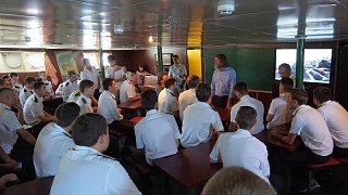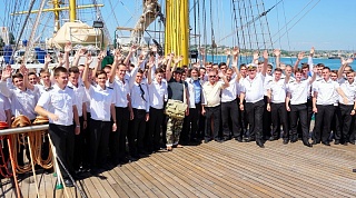 Fedor Konyukhov talked about his recent world record – a voyage round the world in a balloon. The most dangerous moment in the voyage was facing with a thunderstorm front blocking the line of motion in the Atlantic ocean. Moving at high speed, the experienced traveler narrowly escaped a serious collision and slipped the thunderstorm front along its edge, having safely finished the route. Fedor Konyukhov also spoke about his love for the sea. He undertook his first solo expedition when he was 15 years old; he crossed the sea of Azov in a rowboat. Fedor Konyukhov decided to dedicate his life to the sea and graduated from Odessa Maritime Colledge as a ship driver. The great traveler stressed the importance of not only obtaining theoretical knowledge, but also mastering practical skills, which the lads hone in the open sea during shipboard training.