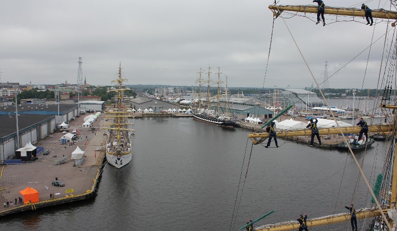 An open board has been organized in Kotka, and excursions are also arranged for everyone who is interested. The sailing ship's crew demonstrates the vessel's construction to the guests and helps them to get acquainted with the style of way aboard the one of the finest and fastest vessels.