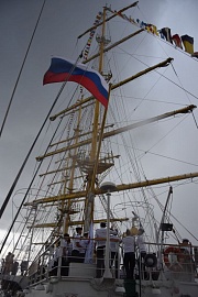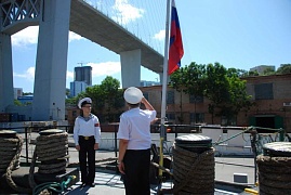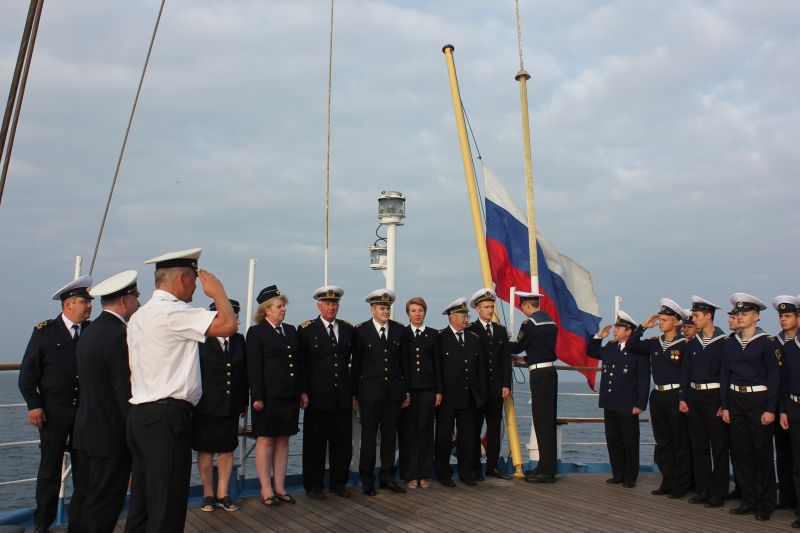 The saucy ships, the Mir, the Nadezhda and the Khersones, the pride of the FSUE “Rosmorport” fleet, also conducted the solemn ceremonies of hoisting the Russian State Flag. Today the tricolored flag is flying on the sailing ships, the Mir and the Nadezhda, over the high seas on both sides of the Eurasian continent. The Russian flag has flied up aboard the Khersones ship in the Black Sea.