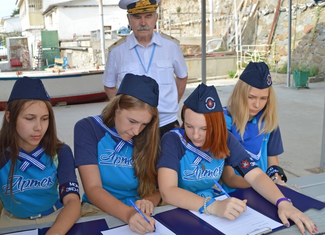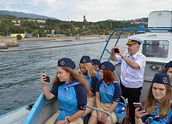 While on the sea, the participants in environmental patrolling took water samples in the water area at the cliffs of Adalar and conducted visual observations. Children assessed the degree of the water transparency, noted the absence of oil strains on the surface and the signs of blooming. The sample of seawater will be examined at a digital chemical laboratory. The results of the researches will be compared with data of the samples that had been taken earlier and sent for expertise at the Institute of Geochemistry and Analytical Chemistry of the Russian Academy of Sciences. Data of environmental monitoring and the results given by professional chemists will make it possible to receive objective information on the environmental situation in the water area of the Artek center.