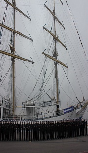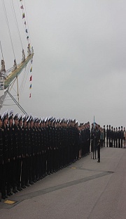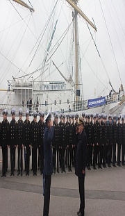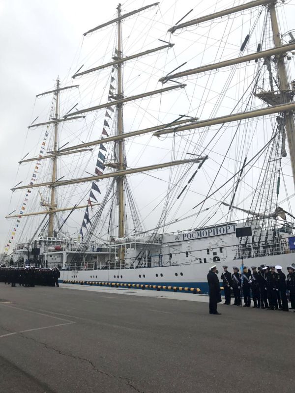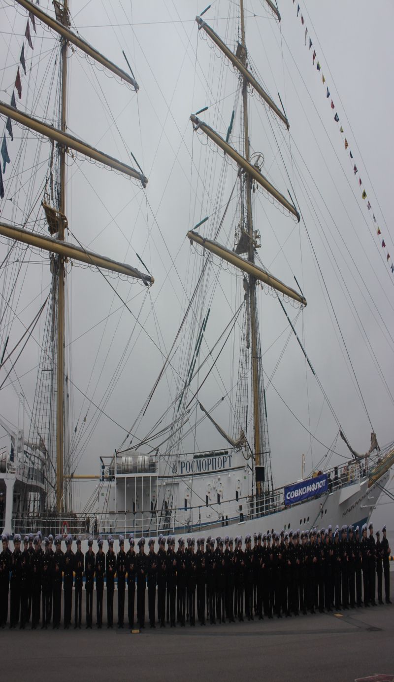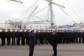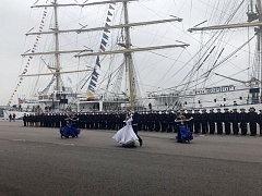 Cadets of the Admiral Makarov State University of Maritime and Inland Shipping greeted the honorable guests by the solemn parade. Cadets studies the basics of maritime affairs aboard the ship. The sailing ship's captain, Andrey Orlov, reported on the arrival of cadets upon completion of training, the absence of incidents during the navigation and the crew's and the ship's preparedness for starting the jubilee.