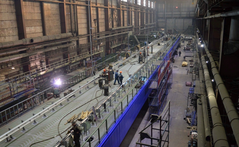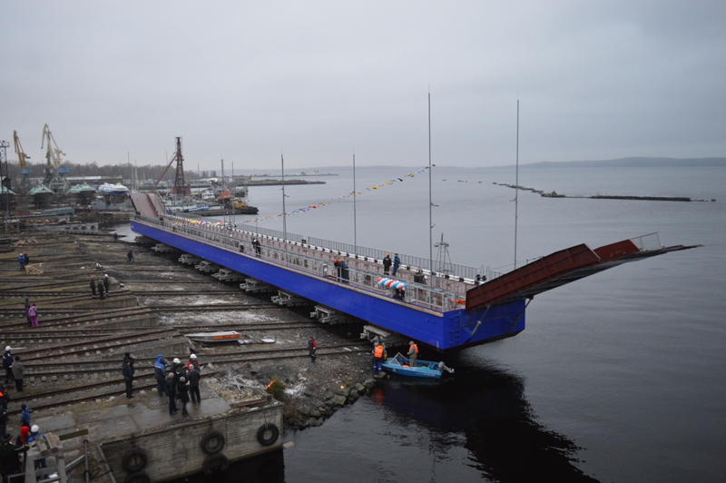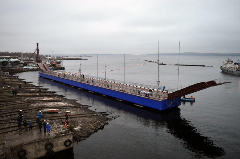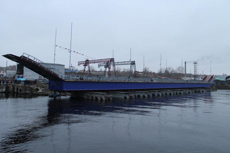 A floating pontoon bridge in the Solomennoye residential area, Petrozavodsk, was set afloat at LLC “Onego Shipyard” on November 17, 2017.