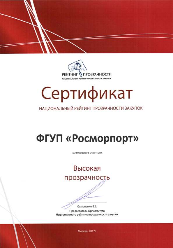 FSUE “Rosmorport” has been included in a list of organizations that carry out procurement activities pursuant to the requirements of Federal Law No 223-FZ of July 18, 2011 and have been conferred the high level of procurement transparency. The results of the rating “The National Rating of Procurement Transparency” were summed up in December 2017.