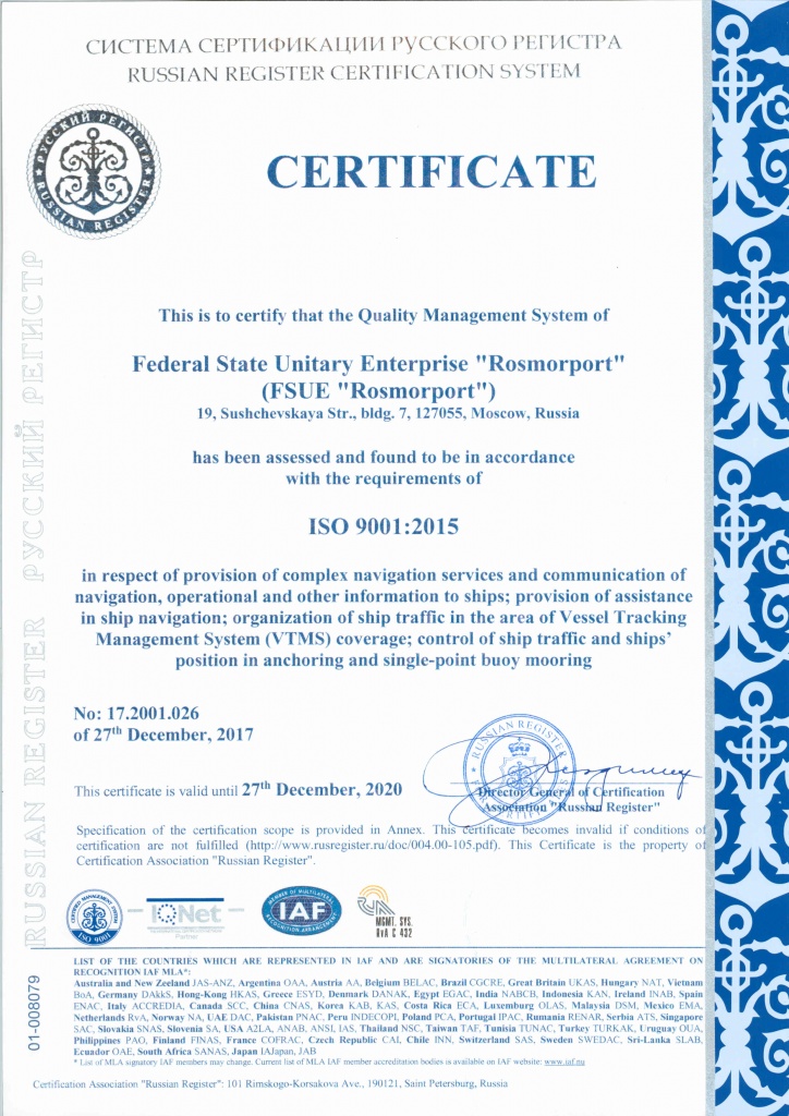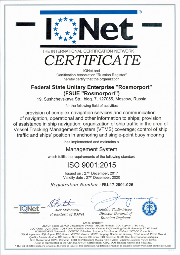 On December 27, 2017 FSUE “Rosmorport” received certificates of compliance of VTMS quality management with ISO 9001:2015 international standard.