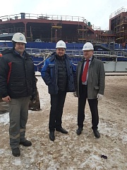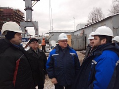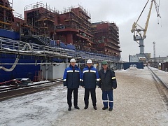 The participants in the meeting inspected the construction of the icebreaker and noted the considerable work rate growth. At the moment the ship hull and the deck structure have been formed. The works are carried out to tighten a high-tension cable, lay a pipeline and make preparations on the isolation mount in rooms. The works are completed to set foundation for equipment. About 600 specialists of the shipyard are involved to carry out these works.