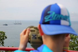 By ancient tradition, this day ships enter the Gurzuf Bay: sailors of the Black Sea congratulate the younger generation. For two consecutive years now the Khersones sailing ship has been taking part in the celebrations marking the anniversary of the Artek center. This year the Kovrovets naval mine-sweeper has kept company for the Khersones frigate. One would watch the ships on the Artek sightseeing platform with the aid of binoculars.
