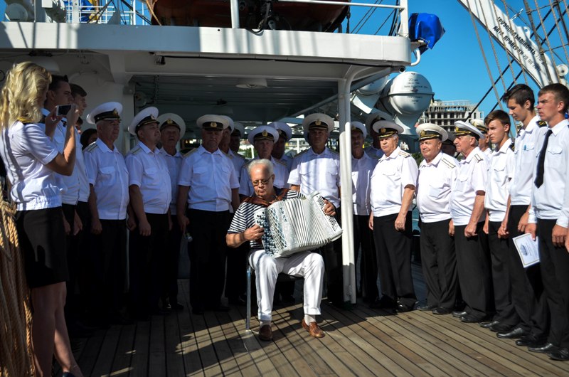 The celebrations, festive mood and music on board of the Frigate lasted though the whole day. The Sevastopol musical band of veterans of the Black Sea Fleet of Russia called “Morskaya Dusha (Sea Soul)” has arrived to congratulate the guests. They performed a series of well-known and favorite sea themed songs