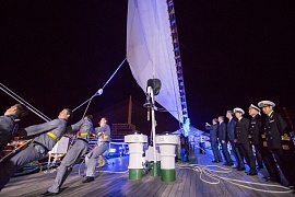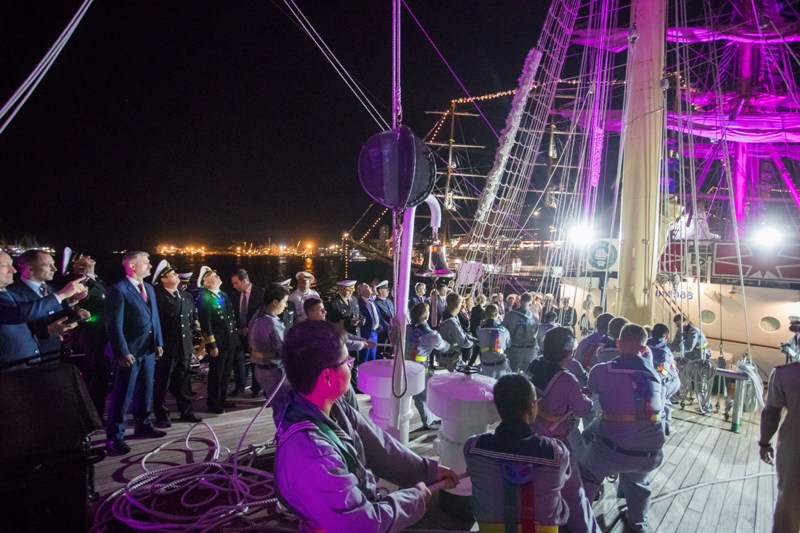 Cadets, who undergo training and study the basics of maritime affairs on the ship, took part in a solemn parade to greet honorable guests. The frigate’s captain, Sergei Vorobyov, spoke about the successful completion of the first stage of SCF Far East Tall Ships Regatta 2018 and the confident victory in the race.