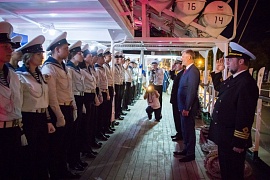 In informal surroundings Yevgeny Ditrikh congratulated the crewmembers and cadets on the victory in the competitions and talked with future old weather-beaten tars and wished them to successfully complete their training, and then work for the sake of Russia’s interests at sea.
