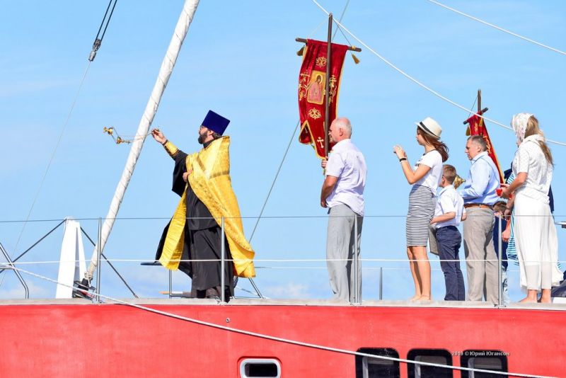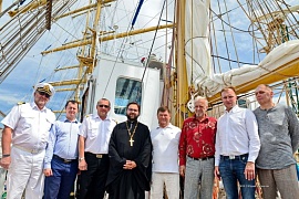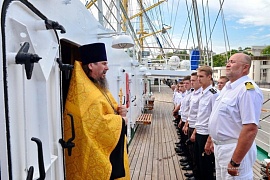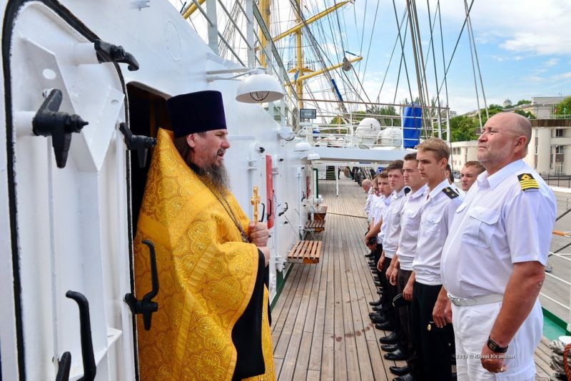The maritime sacred procession, which became a pious tradition on the peninsula, has been held since 2014 within the framework of a scientific and practical expedition “The Crimean Trip Around the World”. The expedition involves representatives of over 200 Russian higher education institutions. This year the events began with dedicating a mobile church aboard the Khersones sailing ship by Reverend Father Sergii of Sevastopol. Then cadets, undergoing training aboard the frigate, were told about the history of the Vesta steamboat, its battle with the Fethi Bulend armored corvette, as well as about the history of shipboard churches.