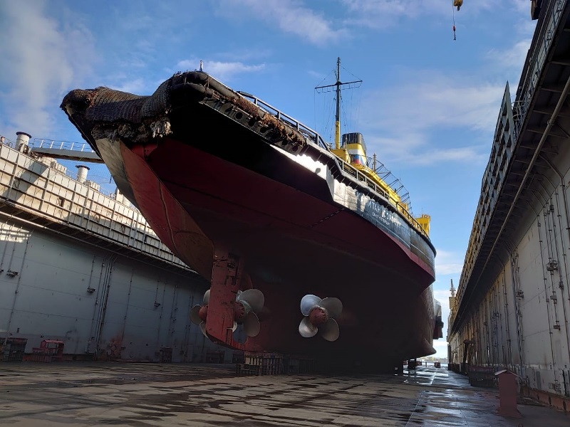 Dock repair has been already started on the Kapitan Sorokin and Ivan Kruzenshtern icebreakers. Such repair includes inspection of the icebreaker’s hull and measurement of residual thicknesses, inspection or replacement of deadweight reinforcements of propeller shaft lines, cleanup and painting of the hull, as well as repairs of the ship’s mechanisms. Starting from July the the Kapitan Nikolaev, the Yermak, the Yuri Lisyansky, the Kapitan Yevdokimov, the Kapitan Bukaev, the Vladivostok and the Tor icebreakers will undergo repair works.