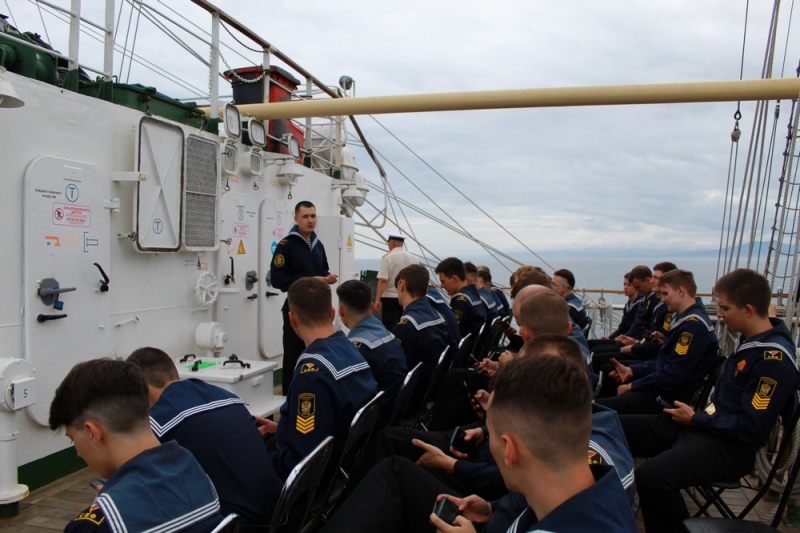 On the training vessels Nadezhda and Professor Khlyustin, cadets of the Admiral G. I. Nevelskoy Maritime State University take part in the sailing practice. At the time of writing the dictation, the sail training ship Nadezhda was located in the Terpeniya bay of the sea of Okhotsk off the South-Eastern coast of Sakhalin island. 30 people took dictation online in English – the Russian version on the site was jammed. According to the ship's captain, one cadet passed for 20 out of 20 points, 7 people received 17 points, the rest - from 12 to 16 points.