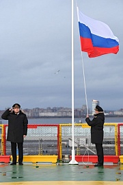 The national flag of the Russian Federation was raised today on the Viktor Chernomyrdin icebreaker of FSUE "Rosmorport" in the presence of the President of Russia Vladimir Putin. The icebreaker was built as part of the "Transport System Development" Federal Target Program. The solemn ceremony was held in Saint Petersburg.