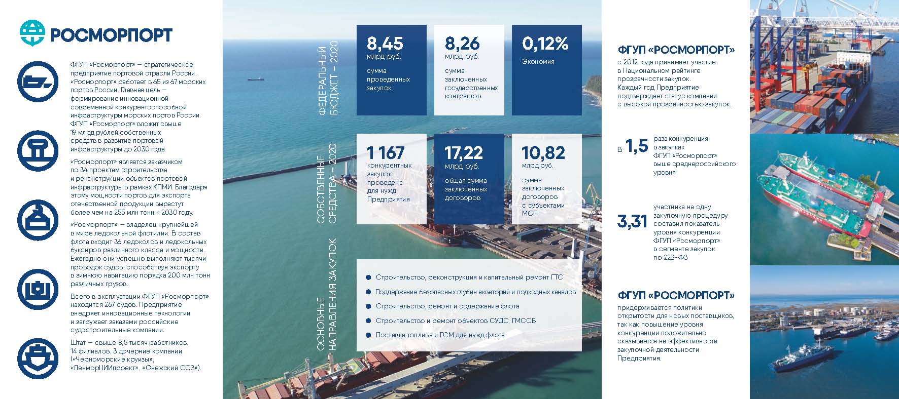The total value of procurements carried out by the enterprise in 2020 with funds from the federal budget is 8.45 billion rubles, and the total value of state contracts concluded is 8.26 billion rubles. Thus, according to the results of competitive procedures, savings amounted to 0.12%. In 2020, at the expense of its own funds FSUE “Rosmorport” conducted 1,167 competitive procurements for the needs of the enterprise, the total value of contracts concluded is 17.22 billion rubles, including 10.82 billion rubles of contracts concluded with SMEs.
