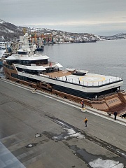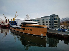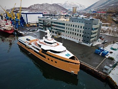 The length of the yacht is 77 meters, it is able to come through ice of 30-40 centimeters thick and be out at sea for up to 40 days. Built in the Netherlands.