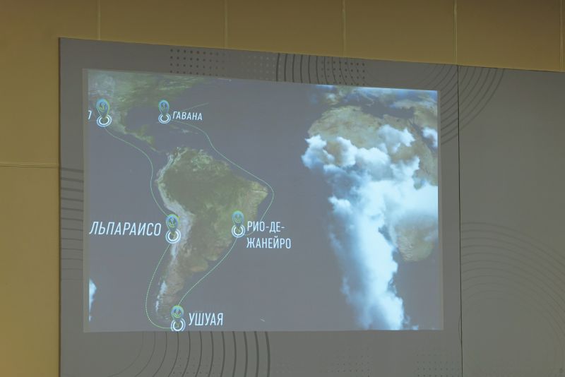 The proposed route includes passage through the Northern Sea Route, a visit to the seaport of Vladivostok on the dates of the annual Eastern Economic Forum, sailing from the Pacific Ocean to the Atlantic Ocean by the Drake Strait around Cape Horn, visiting seaports in countries along the route. It is planned to visit the seaports of South Korea, Japan, China, Germany, France, Denmark, Great Britain, Cuba, Chile, Brazil, Argentina, and Mexico.