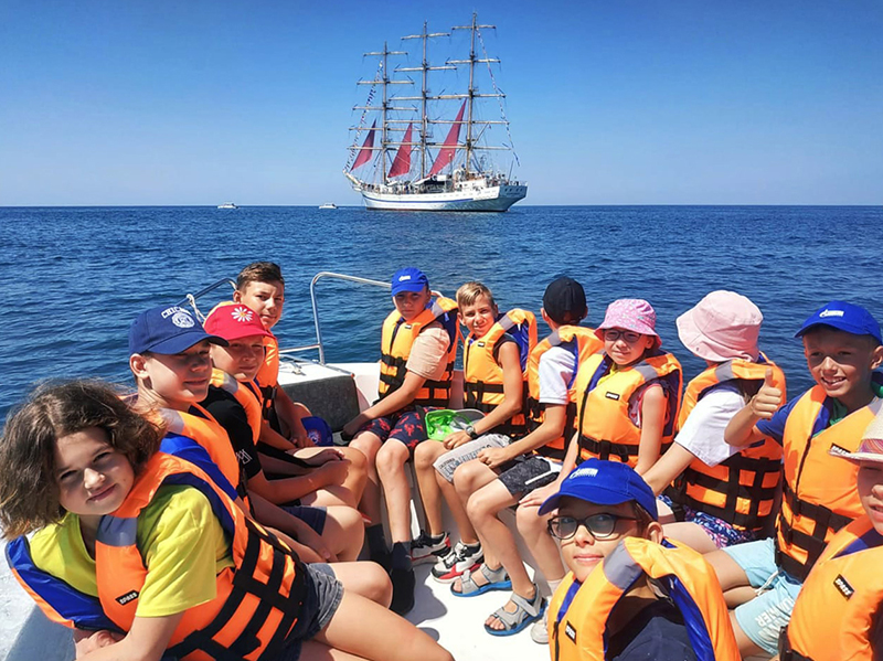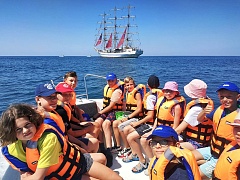 In honor of the celebration of birthday, observation sea excursions by boat, allowing to view the sailboat from close range, were organized for children and employees of the children's center. Training vessel Khersones is 109 meters long, and the height of the grotto mast is 51 meters. The vessel is controlled by 26 sails, which the sailboat team sets in ten minutes – in order to do this, 30 people climb each mast. Two powerful diesel engines allow the vessel to maneuver in the seaport, as well as go in windless weather.