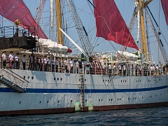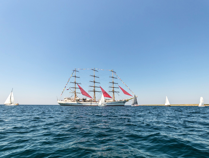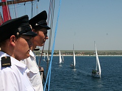 Khersones sailing training vessel took part in “Khersones Sailboat Cup” regatta as the main symbol of the race. Anchored in the Karadzhinskaya Bay at Cape Tarkhankut the frigate with dressing flags greeted the participants and guests of the regatta with a welcoming whistle of the ship's typhon.