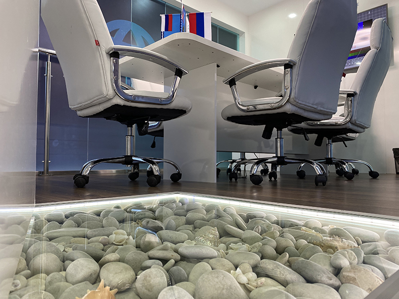 The construction of a unique dynamic exhibit with elements of a sailboat and the SAILING THE GLOBE circumnavigation of the Mir training sailing boat at the XV International Exhibition Transport of Russia was carried out with respect to the advanced modern technologies in order to emphasize the status of the enterprise as a leader in the maritime industry.