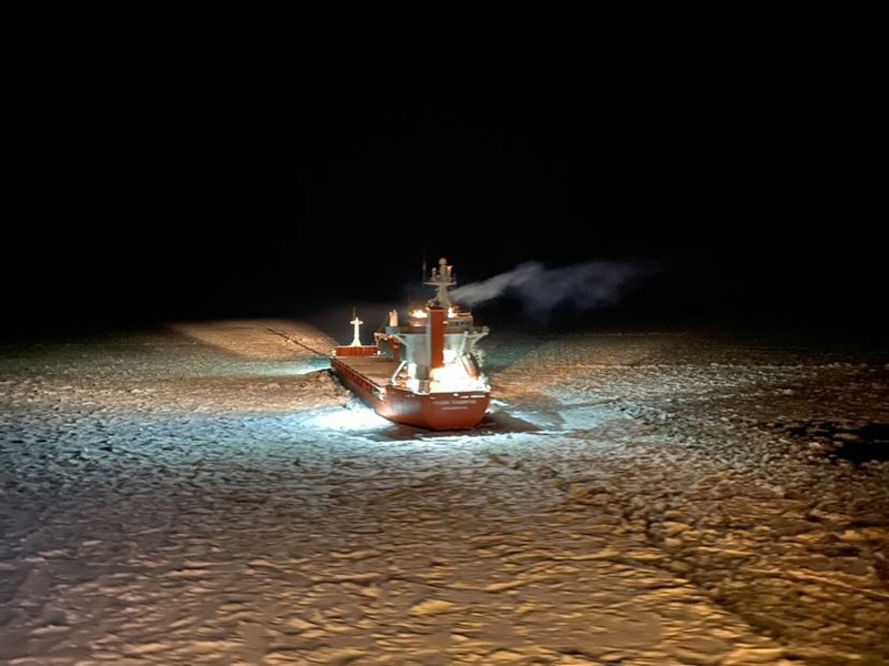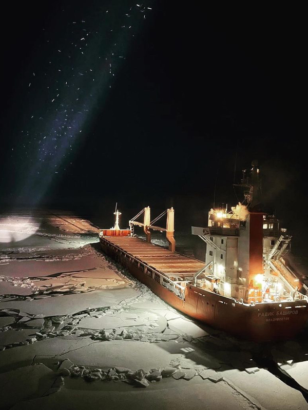The icebreaker Novorossiysk successfully assists the bulker Radik Bashirov from Pevek