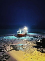 Icebreaking assistance of the vessel from the water area of the seaport of Pevek took place in difficult ice conditions: ice concentration up to 30-40 cm thick reached 7 points, the situation was complicated by ice pressure and ice belts, formed as a result of prolonged wind exposure. In such conditions, independent movement of vessels to the seaports of the Chukotka Autonomous Okrug without icebreaking assistance is limited.