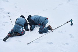 The icebreaker approached the edge of the landfast ice fields between the Kamennye Islands and mainland Russia, east of Dickson, where representatives of the Arctic and Antarctic Research Institute (AARI) and Krylov State Research Center (KSRC) landed on the ice to measure ice thickness and assess ice and snow cover for compliance with ice testing procedures for the new powerful diesel-electric icebreaker.