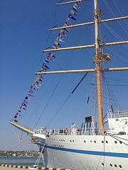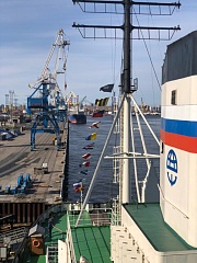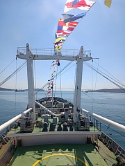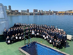 Vessels of the Far Eastern Basin branch took part in the event: the sailing training vessel Nadezhda, the icebreaker Kapitan Khlebnikov, the training and production vessel Professor Khlyustin. On the training and production vessel Professor Khlyustin, located on the roadstead in the seaport of Vladivostok, a solemn formation was held and thematic events were organized with the participation of cadets. All the vessels were decorated with flags of coloring. The victory horn was also sounded on the sailing training vessel Khersones.